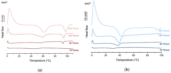 HSDSC thermograms of equimolar KET-LA powder mixtures heated at different rates: (a) KET-PRO and (b) KET-TET.