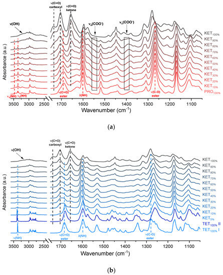 The infrared spectrum of TET starting material (TET I) showed a single sharp band at 3371 cm−1 ascribed to the N–H stretching of the secondary aromatic amino group (Figure 5b), which shifted towards a higher wavenumber in TET II (3387 cm−1). In the spectrum of TET I the stretching of C=O and C–O ester bonds produced bands at 1684 cm−1 and 1279 cm−1, respectively, [35,38] and they shifted to lower wavenumbers (1681 cm−1 and 1261 cm−1, respectively) in TET II. The presence of TET II was also observed in the spectrum of the mixture containing 5 mol% of KET. In the sample comprising 10 mol% of KET broadening and a dramatic decrease in the intensity of the N–H stretching band (3375 cm−1) was observed due to TET molecules being able to interact with KET. The O–H stretching band was detected in the sample containing 90 mol% of KET, and it was difficult to observe it in the samples containing a smaller amount of KET. The position of the ester stretching C–O band was depended on the solid-state properties of the sample: it shifted from 1279 cm−1 (TET I) to 1261 cm−1 in TET II, and in the QC KET-TET samples it was present at 1267 cm−1. A decreased intensity of the ester C=O stretching band was observed in the QC samples. In the sample containing 10 mol% of KET it was localized at 1688 cm−1 and it shifted towards a higher wavenumber corresponding to an increasing KET concentration and overlapped with the carboxyl C=O stretching band. The latter band shifted towards a lower wavenumber and its intensity decreased corresponding to a decreasing KET concentration. The shoulder of the carboxyl C=O stretching band localized at 1737 cm−1 (100% KET) also shifted towards lower wavenumbers and was no longer observed in the sample containing 60 mol% of KET, similar to the KET-PRO system. The IR results indicate that TET interact with KET by strong hydrogen bonding, and the carboxyl group of KET is involved in the interactions. Interactions between KET and TET are sufficiently strong to break the crystal lattice of TET even at KET concentrations as low as 10 mol%. However, in contrast to KET-PRO, in the KET-TET samples carboxylate anion was not detected.