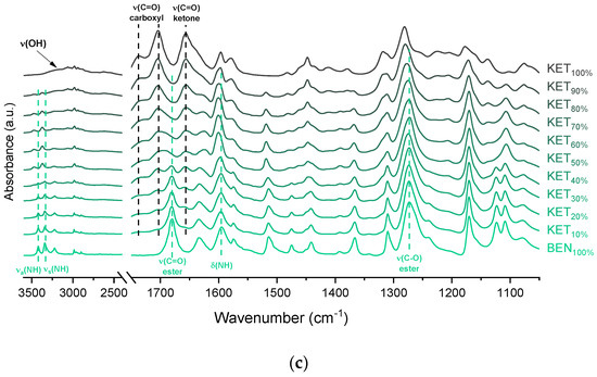 The interactions between BEN and KET were further examined by ATR-FTIR (Figure 5c). The doublet consisting of two bands at 3421 and 3340 cm−1 can be ascribed to asymmetric and symmetric N–H stretching bands, respectively [35,40]. The scissoring band of NH2 is present at 1595 cm−1. The C=O and C–O bonds of aromatic esters produce bands at 1680 and 1273 cm−1, respectively [35]. The latter may overlap with the C–N stretching band characteristic of aromatic amines in the range 1240–1366 cm−1 [35]. In the spectra of QC KET-BEN mixtures the positions of bands at 1273 cm−1 of the ester C-O stretching and at 1656 cm−1 of the stretching of ketone C=O group did not change markedly. In mixtures containing at least 50 mol% of KET the bands at 3421 and 3340 cm−1 of the asymmetric and symmetric N–H stretching bands disappeared, and new bands at 3472 and 3371 cm−1 were observed. The latter bands became noticeable in samples containing 20–30 mol% of KET. Interestingly, in the sample comprising KET 40 mol% both, the two former (3421 and 3340 cm−1) and the two latter (3472 and 3371 cm−1) bands were easily observed. The presence of those bands is in a good agreement with the crystallinity of BEN determined by PXRD and DSC. The packing of BEN molecules in crystals is stabilized by N–H···O hydrogen bonds [42]. Hence, the bands at 3421 and 3340 cm−1 correspond to N–H stretches of the NH2 group in the crystal lattice that interact via H-bonding with the C=O moiety of the ester groups, and the increase in wavenumber to 3472 and 3371 cm−1 is probably due to the liberation of the NH2 groups from the crystal lattice due to interactions with KET. This is consistent with the fact that the band of the ester C=O stretching of BEN (1680 cm−1) was no longer detectable in the equimolar KET-BEN mixture. The peaks characteristic of the NH2 group in the crystal lattice disappear in the samples that do not contain a detectable amount of crystalline BEN (at least 50 mol% of KET). The intensity of the bands characteristic of ‘supercooled’ NH2 groups also agree well with the content of noncrystalline BEN in the sample. The band of the NH scissoring at 1595 cm−1 shifted towards higher wavenumbers (1600 cm−1) in the QC samples containing 50–80 mol% of KET, the band shifted to 1597 cm−1 for the sample containing 90 mol% of KET because it was dominated by the C–C stretching band of KET at 1596 cm−1 [34]. The intensity of the broad O–H stretching band decreased corresponding to a decreasing KET concentration. Interestingly, this band was observed in the sample containing 60 mol% of KET, whereas in the PRO and TET mixtures it was only observed at KET 90 mol%. Also, both shoulders of the C=O stretching group band of the carboxyl acid monomer of KET (1704 and 1737 cm−1) moved to lower wavenumber corresponding to a decreasing KET concentration (1693 and 1727 cm−1 for the equimolar KET-BEN mixture). It can be concluded that KET interacts BEN via H-bonding, as suggested by the negative value of ΔHmix, thereby decreasing the interactions between BEN molecules in the crystal lattice and leading to entrapment of BEN in the supercooled state.