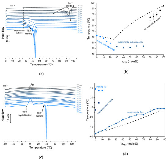 Thermal analysis of KET-TET systems: (a) DSC thermograms from first heating; the broken line indicates the position of the eutectic peak while the arrows show the position of the melting peaks, (b) phase diagram based on thermal analysis of first DSC heating; the broken lines show the theoretical liquidus curves calculated using Equation (1), (c) DSC thermograms from second heating (the samples were first heated 110 °C at 10 °C/min, quench cooled at a nominal cooling rate of 300 °C/min and reheated at 10 °C/min) (d) phase diagram based on thermal analysis of second DSC heating; the broken line shows the theoretical Tg values calculated using Equation (2). For plots (a) and (c) the subscript indicates the content of the named component in mole%.