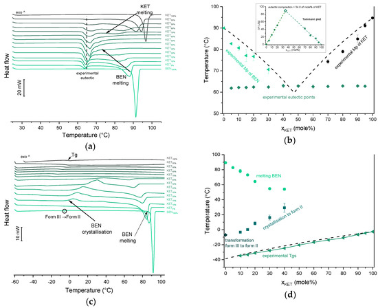 Thermal analysis of KET-BEN systems: (a) DSC thermograms from first heating; the broken line indicates the position of the eutectic peak while the arrows show the position of the melting peaks, (b) phase diagram based on thermal analysis of first DSC heating; the broken lines show the theoretical liquidus curves calculated using Equation (1). The Tammann plot is shown in the inset; the broken lines present the best linear fits to the experimental data, (c) DSC thermograms from second heating (the samples were first heated 110 °C at 10 °C/min, quench cooled at a nominal cooling rate of 300 °C/min and reheated at 10 °C/min) (d) phase diagram based on thermal analysis of second DSC heating; the broken line shows the theoretical Tg values calculated using Equation (2). For plots (a) and (c) the subscript indicates the content of the named component in mole%.