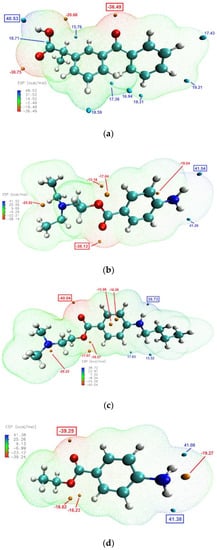 Electrostatic potential of: (a) KET, (b) PRO, (c) TET and (d) BEN mapped on the 0.001 au contours of the electron density of the molecules optimized by DFT. The negative regions are indicated in blue, while the positive regions are shown in red. Surface local minima and maxima (only values > 15 kcal/mol) are represented as orange and cyan points, respectively. The global maximum and minimum for every molecule are shown in boxes in large font. The unit is kcal/mol.