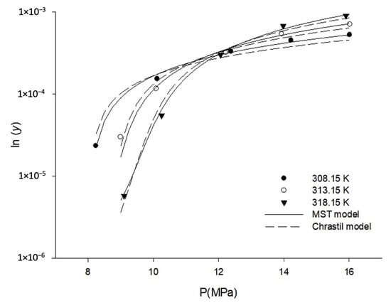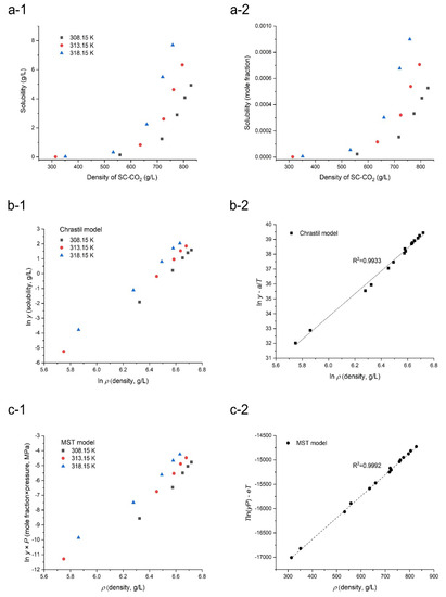- Chrastil, J. Solubility of solids and liquids in supercritical gases. J. Phys. Chem. 1982, 86, 3016–3021. [Google Scholar] [CrossRef]