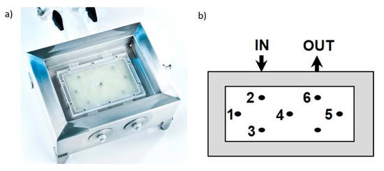 (a) Actual freezing chamber of the freezing unit with respective temperature probes inside the chamber; (b) sketch of the chamber and location of temperature probes.