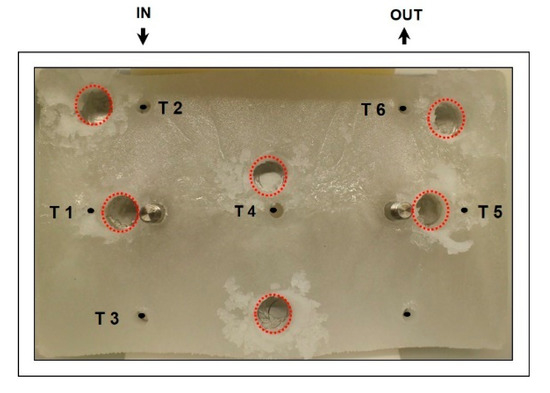 Frozen sample block after freezing cycle. The dots represent the temperature probes (compare to Figure 1b) including legend T 1 to T 6 including temperature measurement at the inlet and the outlet (IN and OUT). Red dotted circles represent the drilling holes for spatially resolved sampling.