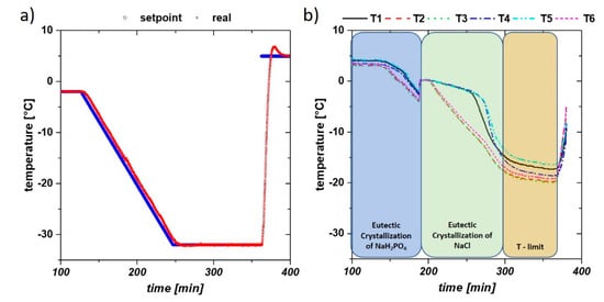 (a) Thermostat setpoint and measured temperature at freezing rate of 0.25 °C/min; (b) actual temperature of the thermocouples inside the chamber (sketched in Figure 1b), showing inhomogeneous freezing in the chamber. The final temperature had a difference of over 10 °C between thermostat and chamber marked as T limit of the cell.