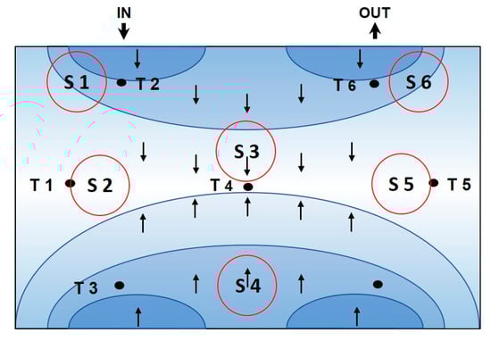 Sketch of the freezing characteristics inside the small-scale device based on the temperature data. Red circles indicate the points of sampling, T the temperature probes. Blue ellipsoids and arrows indicate the direction of the freezing front.