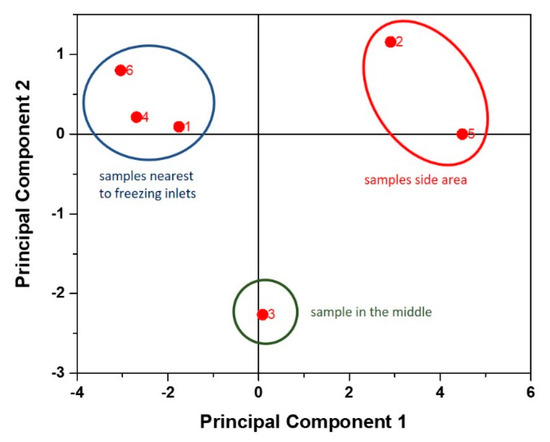 Freezing within the sample block was shown to occur in an inhomogeneous manner with ice nucleation and freezing starting at the areas perpendicular to the in/outlet of the cooling fluid. The latest point of freezing happened in the side regions of the sample block indicated by the temperature profiles. This resulted in high accumulation of salts in the formulation buffer as well as the target protein. In a first approach, we analyzed the datasets (precentral change to the start material) for IgG titer, conductivity, and mAB aggregation measured at 210 nm at the UV detector of the HPLC (see Supplementary part) using principal component analysis (PCA) with the software package for multivariate analysis in OriginLab2016 (OriginLab Corporation). We analyzed the correlation matrix of the data set and two principal components could describe the variance in the data set of the six samples to 92.2% cumulative. The score plot for the PCA is given in Figure 5.