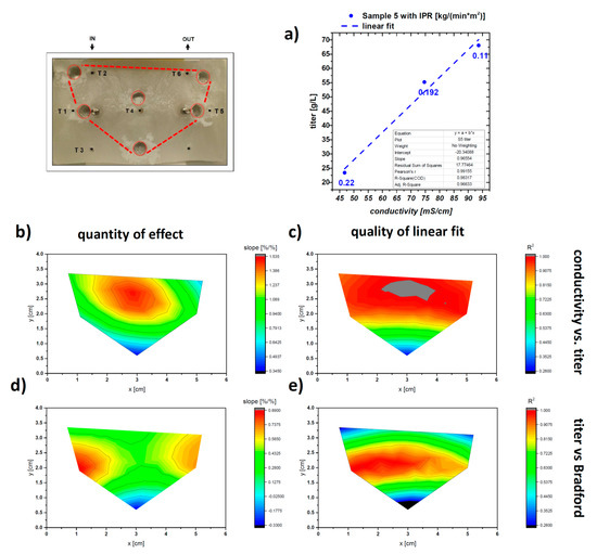 Analysis of the samples after freezing (a) exemplary linear fit of conductivity vs. titer; (b) Correlation of conductivity vs. titer, evaluated via linear regression based on the sampling points in Figure 2. A high correlation between conductivity and mAB titer is found with a R2 (c) of 0.8 to 1 in the upper part of the sampling area: (d) Titer correlated to Bradford total protein measurement. In the regions of interests, a well-suited correlation can be found (e). HPLC measurements could be reproducibly replaced by photometric Bradford assays.