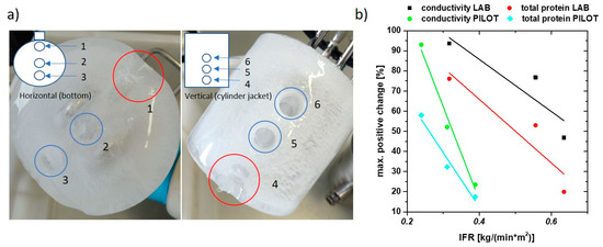 (a) Sampling scheme for tests with the pilot-scale system. Three samples were taken at the bottom of the frozen sample (horizontal) and three samples next to the jacket in different height (vertical); (b) conductivity and total protein concentration change in % vs. IFR. Very similar dependence for small scale and pilot scale is found.
