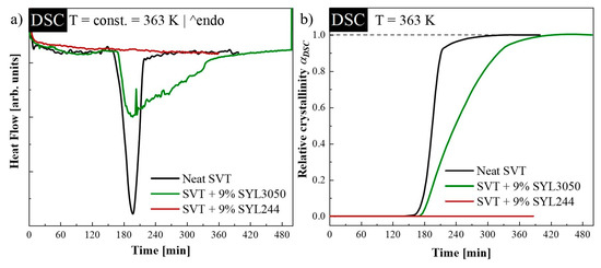 (a) Differential Scanning Calorimetry (DSC) traces of neat simvastatin (SVT) (black line), SVT + 9 wt. % of SYL3050 (green line), and SVT + 9 wt. % of SYL244 (red line) recorded during isothermal crystallization at 363 K (b) and corresponding relative crystallinity (αDSC).