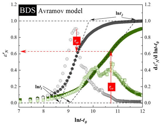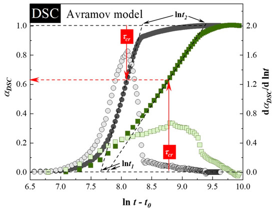 where (α(t))′max is a maximum value of the first derivative of the normalized degree of crystallization. The second approach of evaluation the Avramov parameter related to the nucleation dimensionality is based on drawing a tangent to the experimentally determined sigmoidal curve αDSC(ln(t − t0)) at t − t0 = τcr (see dashed lines in Figure 2). By determining the values of ln t1 and ln t2, which corresponds to the points of intersection of the tangent line with the horizontal straight lines, constructed at the limit values of αDSC, i.e., at 0 and 1, it is possible to establish the n parameter from the following formula: