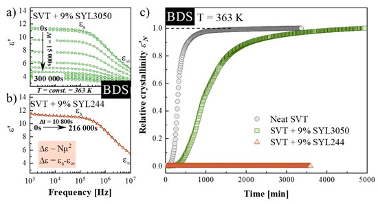(a) Dielectric spectra of the real parts of the complex dielectric permittivity during an isothermal crystallization of SVT + 9 wt. % of SYL3050 performed at 363 K, (b) dielectric spectra of the real parts of the complex dielectric permittivity collected during the time-dependent isothermal experiment of SVT + 9 wt. % of SYL244 performed at 363 K, (c) normalized dielectric constants ε′N as a function of time from crystallization processes occurring at 363 K.
