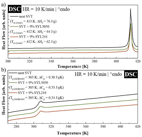 DSC thermograms of (a) crystalline and (b) amorphous SVT (grey lines), SVT + 9 wt. % of SYL3050 (green lines), and SVT + 9 wt. % of SYL244 (red lines).
