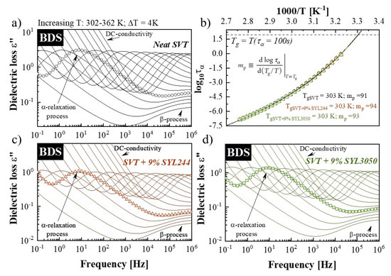 Dielectric loss spectra of (a) neat SVT, (c) SVT + 9 wt. % of SYL244, and (d) SVT + 9 wt. % of SYL3050 collected above their respective Tgs upon heating. In panel (b), activation plots are constructed for the tested compounds with gray circles, red triangles, and green squares referring to temperature dependences of α-relaxation times for neat SVT, SVT + 9 wt. % of SYL3050, and SVT + 9 wt. % of SYL244, respectively. The solid lines are the fitting results by the Vogel−Fulcher−Tammann (VFT) equation.