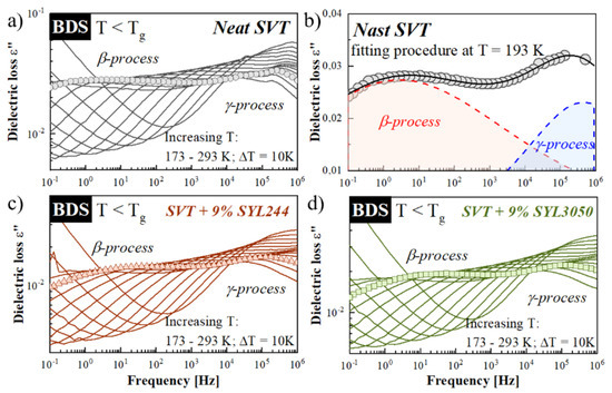 The dielectric loss spectra of (a) neat SVT, (c) SVT + 9 wt. % of SYL244, and (d) SVT + 9 wt. % of SYL3050 registered at temperatures below Tg. (b) Selected spectrum of neat SVT with two well-visible secondary relaxation processes β and γ.