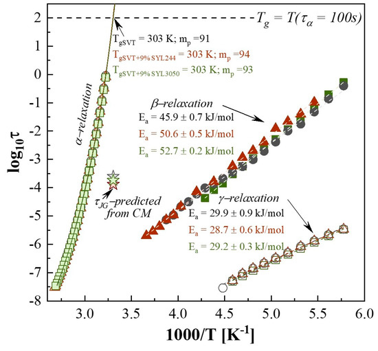 Two secondary relaxations (β and γ) were observed for both the neat SVT and that in mixtures with SYL244 or SYL3050. Both modes move toward higher frequencies with increasing temperature, indicating an increase in molecular mobility. To determine the values of τβ and τγ, the spectra of each sample have been fitted by two Cole−Cole (CC) functions. The example of the performed fitting procedure is presented in panel b of Figure 10. It is worth recalling that the CC function is a special case of the HN function (Equation (5)) in which the b parameter is fixed at 1. As Figure 11 presents, in the glassy state of SVT, both τβ(T) and τγ(T) exhibit a linear dependence, and consequently can be well described by the Arrhenius equation: