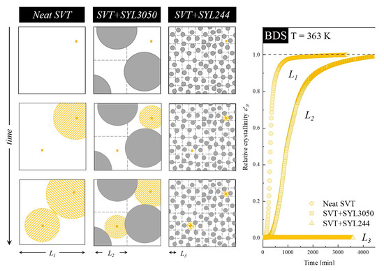 The time evolution of crystallinity of neat SVT (circles), SVT + 9 wt. % of SYL3050 (squares), and SVT + SYL244 (triangles), which were obtained from dielectric studies and described in Section 3.2, together with the schematic explanation of the stabilization mechanism by MS materials. Yellow dot, yellow patterned circles, and gray filled circles represent SVT nuclei, SVT crystals, and MS particles, respectively.