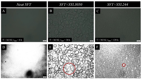 (A–C) The optical images, which were collected at 5× magnification, of neat SVT, SVT + 9 wt. % of SYL3050, and SVT + SYL244 (the scale bars are equal to 50 µm). (D–F) The images from panels A–C with artificial contrast (the red circles represent the representative free areas of the SVT alone and in mixture with MS).