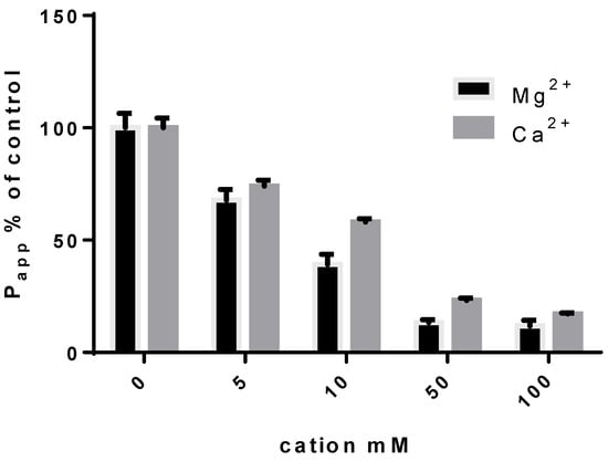 Influence of the Mg2+ or Ca2+ concentration on the ciprofloxacin (CIP) Papp across the lung epithelial cell monolayer (Calu-3 cells) [23,31]. The apparent permeability was evaluated in the apical-to-basal direction. The same 50 µM concentration of CIP was used in each condition, in the presence of different concentrations of Ca2+ or Mg2+.