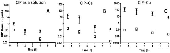 CIP concentration profile in the lung epithelial lining fluid (ELF) (plain dot) and free CIP plasma concentration profile (open square) obtained after IT administration to rats of (A) a CIP solution, (B) particles loaded with the CIP–Ca low-affinity complex, or (C) particles loaded with the high-affinity CIP–Cu complex. The CIP dose was 3 mg/kg. Each point is an averaged value ± standard deviation (SD) of 4–7 individual measurements (adapted from Lamy et al. [22]).