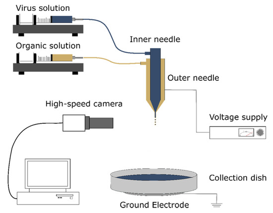 Electrospraying has been studied extensively in biomedical research for its ability to form droplets containing sensitive biological material such as cells and to produce drug-loaded particles with a narrow size distribution [20,21]. In 2003, core-shell structures were obtained by coaxially aligning two capillaries in an electrospraying system [22]. Since then, coaxial electrospraying has demonstrated successful encapsulation and controlled release of proteins that retain high levels of bioactivity after processing [23]. However, whilst it is known that electrospraying can be used with proteins and cells with little or no effect on bioactivity, there has been very limited investigation of its use with viruses [23,24]. Electric fields of the magnitude required for electrospraying (typically kV) could potentially affect viral viability through reactive oxygen species (ROS) generation and/or irreversible electroporation. In a standard electrospraying setup in which corona discharge and dielectric breakdowns are avoided, ROS, specifically ozone and hydrogen peroxide, are generated in vanishingly small quantities [25]. Even so, biomolecules that are especially susceptible to oxidation and are electrosprayed in solution at sub mg/mL concentrations can undergo substantial denaturation via heavy metal-catalysed oxidation [25]. Similarly, the electric field may itself damage the virus. To the best of the authors’ knowledge, the first report of inactivating microorganisms, namely bacteria, with strong electric fields dates back to 1967 [26]. The mechanism of inactivation was more fully understood later as irreversible electroporation, wherein a membrane acting like a capacitor becomes charged and induces a permeabilizing transmembrane potential that either increases osmotic potential to the point of lysis or ruptures the membrane outright [27]. The membrane radius is an important factor, as the magnitude of the transmembrane potential increases with the radius at a constant field strength [28]. Moreover, it is important to consider the ability of the material being encapsulated to respond to changes in the microenvironment. For instance, cells can have complex membrane machinery in the form of protein ion pumps that allows for the active regulation of ion balance and eukaryotic cells employ rGSH to alleviate oxidative stress [29]. Viruses generally lack the capacity to respond to osmotic and oxidative stress with the same sophistication.