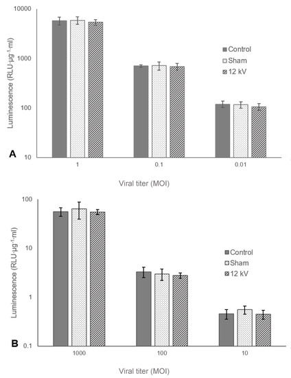 Immortalized human alveolar adenocarcinomic cells (A-549s) were grown in Dulbecco’s modified Eagle medium (DMEM) with 10% fetal bovine serum (FBS) and 1% penicillin/streptomycin (P/S). Immortalized Chinese hamster ovarian cells (CHOK1s) were grown in Ham’s F-12 medium with 10% FBS. Cells were grown in a temperature- and CO2-controlled incubator at 37 °C and 5% carbon dioxide (CO2). Cells were passaged every three days at approximately 80% confluence. In preparation for transduction by either Ad or MVA, A-549 cells were seeded on a 96-well plate at a concentration of 104 cells per well and left to incubate at 37 °C, 5% CO2 for 24 h before any virus was added. Ad infectivity after electrospraying was assessed by removing all media from the wells and subsequently adding a solution containing a mixture of electrosprayed and/or solvent exposed Ad in PBS and DMEM such that the multiplicity of infection (MOI) was either 10:1, 100:1, or 1000:1. The same was done in the case of MVA, but the MOI employed was either 0.01:1, 0.1:1, or 1:1. Cells were then left to incubate again for 24 h at 37 °C, 5% CO2. To expose the luciferase contained intracellularly, media was replaced with the lysis buffer solution, and cells were left overnight at −80 °C and thawed the next morning. In a white, opaque 96-well plate, lysed cell solution was added followed by an equal amount of luciferase reagent. The resulting luminescence was measured using a microplate reader (FLUOstar Omega, BMG Labtech, Ortenberg, Germany). To express luminescence intensity as a function of total protein content, a BCA assay was also performed to quantify the amount of protein in each well.