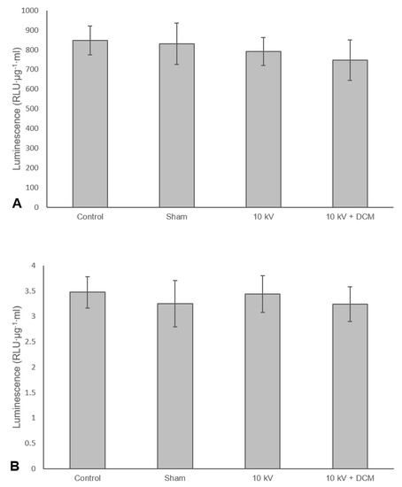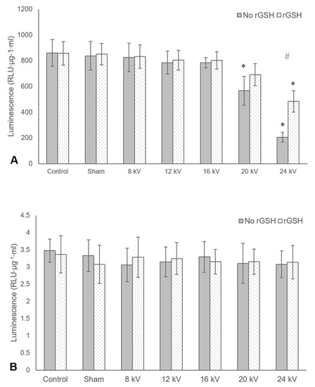 Mean average luminescence, represented as relative light units adjusted for protein concentration, measured after lysis of cells incubated with either electrosprayed MVA (A) or Ad (B) with or without the presence of rGSH. Working distance: 7.25 cm, flow rate: 10 µL/min. Error bars represent the standard deviation, n = 3. Two-way ANOVA and Tukey–Kramer post-hoc tests were used to make statistical comparisons. A p-value of less than 0.05 was considered statistically significant. A single asterisk indicates significance compared to respective group control, a hash symbol indicates significance within a given voltage.