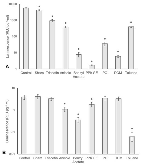 In the case of MVA (Figure 4A), there was a significant difference in infectivity between each of the solvent groups. Triacetin was found to be the least damaging, producing an 83.4% (SD ± 3.3%) decrease in infectivity compared to the control. Benzyl acetate, PPh GE, PC, and DCM were the most harmful, all reducing infectivity by more than 99%. Interestingly, the sham treatment of vortexing without the addition of solvent also caused a significant decrease in infectivity (23.8%, SD ± 6.1%), suggesting that MVA may be susceptible mechanical stress. Ad (Figure 4B) demonstrated greater stability to solvent exposure, as only anisole, benzyl acetate, PPh GE, and Toluene caused a significant decrease in infectivity.
