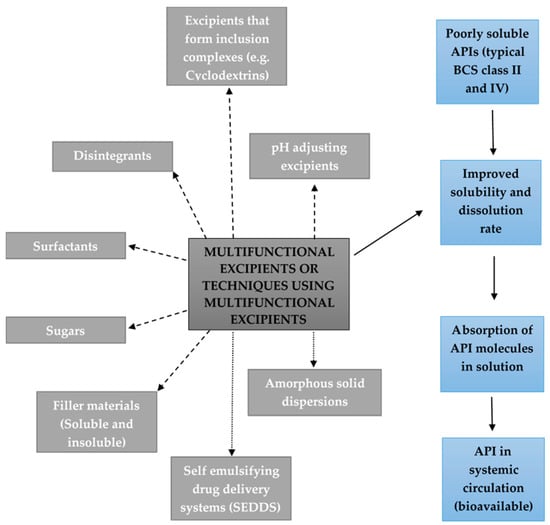 Different classes of functional excipients and techniques using functional excipients that influence either the solubility/dissolution and/or membrane permeation/absorption and consequently the bioavailability of poorly soluble active pharmaceutical ingredients (APIs).