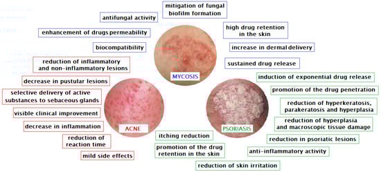 Skin diseases are one of the most common disorders affecting people around the world. Although the mortality rates are lower than for many other diseases, skin problems have a significant impact on the quality of life of people who suffer from them. Very often, these diseases are associated with many skin lesions, persistent itching, and pain, which significantly reduce quality of life, stimulate social isolation, and are comparable to the feelings of people suffering from various chronic non-dermatological diseases [3]. The prevalence of skin and skin-related disorders may vary depending on age and gender as well as geographical areas [4]. Skin conditions affect people of all ages living in both developed and developing countries. Therefore, there is an urgent need to develop effective remedies and treatment methods to minimize the effects of these diseases. This is extremely important, because as the data show, the percentage of treatment failures is still very high [3]. Analyses regarding global disability and mortality caused by skin diseases carried out by team members of the Institute of Health Metrics and international skin experts in dermatoepidemiology showed that the most common skin conditions are various dermatitis conditions mainly atopic, psoriasis, seborrheic and contact, pyoderma, or cellulitis. A high incidence of such diseases as scabies, viral and fungal skin disorders, decubitus ulcer, urticaria, acne vulgaris, alopecia areata, and pruritus is also observed. Among the more serious skin conditions that are common in the population are malignant skin melanoma and keratinocyte carcinoma, both basal and squamous cell carcinomas [5].