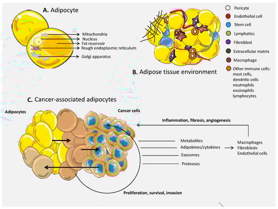The composition and role of adipose tissue in cancer development. (A) Adipocytes are complex cellular entities containing nucleus, mitochondria, Golgi apparatus and rough endoplasmic reticulum and the fat reservoir that occupies the majority of the cellular space. (B) The adipose tissue is composed of, besides adipocytes, numerous cell types, including: endothelial cells, pericytes, stem cells fibroblasts and cells of the immune system, all of which have functional roles in the tissue homeostasis. (C) Adipocytes, upon malignant pressure, can switch into cancer-associated adipocytes (CAAs) that contribute to the installation and development of the tumor mass through secreted metabolites, adipokines/cytokines, exosomes and proteases, with roles in cell proliferation, survival and invasion. The influence of the secreted adipokines/cytokines is also retained on the cells of the tumor environment cells, sustaining processes like inflammation, angiogenesis and fibrosis.