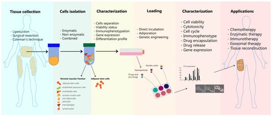 Main adipose tissue processing steps for developing adipocytes-based delivery systems with medical applicability. Once the adipose tissue is collected employing one of the three most used protocols (liposuction, surgical resection or Coleman’s technique), the next step involves cells’ isolation: enzymatic, non-enzymatic or mechanical disruption and a combination between these two. The resulted cell populations: stromal vascular fraction and adipose stem cells, undergo further characterization in order to select the proper cells according to the aim of study (most of the studies use adipose stem cells in their strategies). The loading steps refers to the encapsulation of various drugs, pro-drugs, NP formulations and also nucleic acids into adipocytes via direct incubation, adiporation or genetic engineering. The success rate of these modifications can be mainly assessed through biological and physico-chemical characterization.