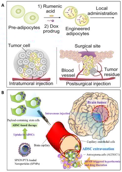 Therapeutic strategies involving adipocyte-based drug delivery. (A) Schematic description of pDox and RA encapsulated into adipocytes and inoculated intratumorally or within the tumor resection cavity (in vivo model: melanoma); Reprinted from Matter, Cell Press, Vol 1/Issue 5, Author(s): Di Wen, Jinqiang Wang, George Van Den Driessche, Qian Chen, Yuqi Zhang, Guojun Chen, Hongjun Li, Jennifer Soto, Ming Liu, Masao Ohashi, Zejun Wang, Peter Abdou, Quanyin Hu, Gianpietro Dotti, Song Li, Denis Fourches, Zhen Gu, Title of article: Adipocytes as Anticancer Drug Delivery Depot, Pages No.: 1203–1214, Copyright (2019), License Number 4794211061175 with permission from Elsevier []. (B) Schematic description of the ADSC-mediated delivery of SPNPs toward brain tumors for dual-modality treatment of orthotopic astrocytoma; Reprinted from Journal of Controlled Release, Vol 254, Author(s): Wen-Chia Huang, I.-Lin Lu, Wen-Hsuan Chiang, Yi-Wen Lin, Yuan-Chung Tsai, Hsin-Hung Chen, Chien-Wen Chang, Chi-Shiun Chiang, Hsin-Cheng Chiu, Title of article: Tumortropic ADSCs carrying smart nanotherapeutics for targeted delivery and dual-modality therapy of orthotopic glioblastoma, Pages No.: 119–130, Copyright (2017), License Number 4794271120645 with permission from Elsevier [].