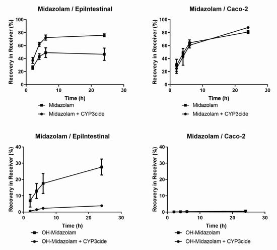 Apical-to-basal transport of midazolam in EpiIntestinal microtissues and Caco-2 cells. Midazolam (10 µM) was added to the apical compartment of EpiIntestinal microtissues (left panels) or Caco-2 cells (right panels) grown on Transwell inserts and incubated at 37 °C. At the time points as indicated, samples were taken from the basal (receiver) compartment. Midazolam (upper panels) and 1-Hydroxymidazolam (lower panels) were quantified in the samples via HPLC-MS/MS. The incubation was carried out in the absence or in the presence of the selective covalent CYP3A inhibitor CYP3acide (1 µM). Data are shown as mean values of triplicates. Error bars show standard deviations.