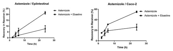 In contrast to CYP3A4, CYP2J2 activities were readily detected both in EpiIntestinal microtissues and in Caco-2 (Figure 2). In both models, co-incubation with the CYP2J2 inhibitor Ebastein (50 µM) [26] increased the availability of astemizole in the receiver compartment.