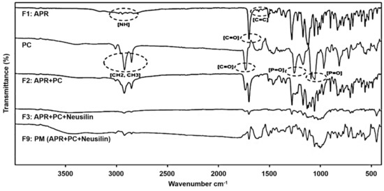 Fourier transform infrared spectroscopy (FTIR) overlay spectra of solid dispersions. F1: pure aprepitant (APR); F2: solid dispersion consisting of APR and phosphatidylcholine (PC); F3: solid dispersion consisting of APR, PC, and Neusilin®; F9: physical mixture (PM) of APR, PC, and Neusilin®; PC: solid dispersion consisting of PC.