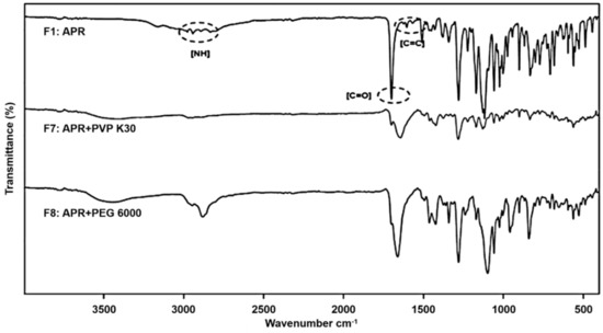 FTIR overlay spectra of solid dispersions. F1: pure aprepitant (APR); F7: solid dispersion consisting of APR and polyvinyl pyrrolidone (PVP) K30; F8: solid dispersion consisting of APR and polyethylene glycol (PEG) 6000.