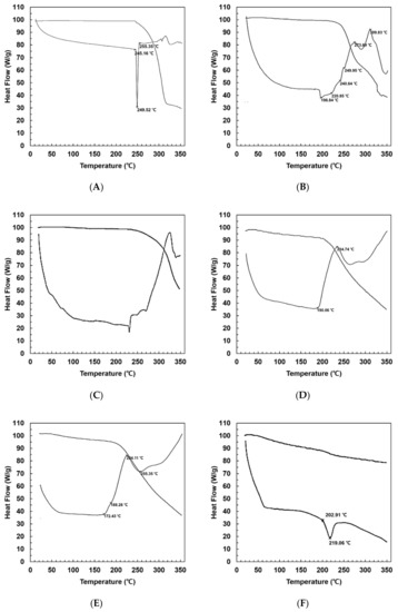 DSC measurements were performed to study the physical state of APR and the ingredients of PC-based dispersions. Figure 3 shows thermograms of F2, F3, and F9 in comparison with those of F1 (pure APR), pure PC, and pure Neusilin®. The DSC curves for APR and Neusilin® had a single endothermal peak for the melting of APR (249.5 °C) and Neusilin® (219.0 °C), as shown in Figure 3A,F. PC had more than three endothermal peaks over 200 °C (Figure 3C). Regarding solid dispersions, F2 had four endothermal peaks at 196.8, 220.8, 240.6, and 249.9 °C (Figure 3B). However, F3 did not show any peaks but demonstrated an endothermal aspect from 190.6 °C to 234.7 °C (Figure 3D). According to the DSC patterns of APR and PC, the polymorphism phases of APR and PC appear to be crystalline because they demonstrated specific melting point peaks. The DSC pattern of F2 indicated that the endothermal peaks for the melting were lower than the original peaks of APR and PC, but the change to an amorphous phase was insufficient. In contrast, the endothermal peaks of F3 demonstrated that the solid dispersions changed to an amorphous phase because specific peaks were absent. This suggests that Neusilin® can change the crystalline phase of APR to an amorphous phase. In addition, the increase in amorphous degree increases enthalpy but decreases physical stability, which is related to the increase in solubility and initial dissolution rate of APR in the solid dispersion [14,45].