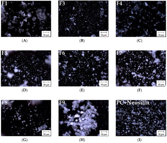 Microscopy was used to compare the morphology and particle size of each formulation. Figure 4 shows the surface images by cross-polarized light of F3–F9 in comparison to those of F1 (pure APR) and the solid dispersion made by PC and Neusilin®. The morphology of pure APR indicated a broad plate shape of crystalline structures (Figure 4A). For F3 and F4, crystalline structures were absent, and only small particles were detected (Figure 4B,C). The morphologies of F5 and F6 revealed no crystalline particles, and the particle sizes were similar to those of F3 (Figure 4D,E). Regarding the polymer-based solid dispersions, the morphologies of F7 and F8 were crystalline structures but not of the form noted for APR (Figure 4F,G). For the physical mixture, the particle morphology of F9 was heterogeneous in form, and some of the particles looked similar to the pure APR shapes (Figure 4H). These observations are consistent with the conversion of APR crystalline phases to amorphous forms by dispersing the APR into the solid matrix. Adsorbents can prevent aggregation because a drug can access their intra-particle pores [47]. Therefore, the formulations using adsorbents produced small particles and crystal particles were not present. Regarding the effect of disintegrants, both disintegrants more homogeneously separated APR into the matrix of PC-based dispersions than formulations using only PC and adsorbents. It has been suggested that the crosslinked microfibril that facilitates water swelling creates more amorphous particles in PC-based dispersions [48]. In the polymer-based dispersion, the crystalline phase of APR decreased, but its conversion to an amorphous phase was likely insufficient. The morphological studies reported by Schachter et al. confirmed that ketoprofen-dispersed, poly(ethylene oxide)-based solid dispersions produced both crystalline and amorphous regions [49]. Therefore, although the crystalline regions of a polymer-based dispersion lead to stabilization of the formulation, they cause delayed drug dissolution due to interference.