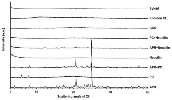 The XRPD patterns for the pure ingredients, physical mixture, and solid dispersions of APR are shown in Figure 5 and Figure 6. The diffractogram of APR showed crystalline phases and demonstrated characteristic peaks at 8.25°, 17.22°, 20.57°, 20.65°, 22.99°, 23.62°, and 23.37° (2θ). The diffractogram of PC showed highly amorphous phases and demonstrated characteristic peaks at 3.95°, 5.93°, 6.47°, and 7.92° (2θ). In addition, the diffractograms of Neusilin®, Syloid®, CCS, and Kollidon® CL as adsorbents and disintegrants demonstrated amorphous phases because there were no characteristic peaks.