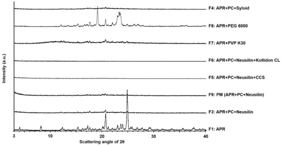 The FTIR study was carried out to determine the chemical interactions between APR and the dispersion ingredients. Figure 1 shows the FTIR spectra of F2, F3, and F9 in comparison with F1 (pure APR) and PC. The FTIR spectrum of pure APR showed characteristic peaks at 2943, 2893, and 2834 cm−1 (N–H stretching); 1700 cm−1 (C=O stretching); and 1605 cm−1 (C=C stretching) as summarized in Table 2. The FTIR spectrum of F2 indicated that there were slight changes in the fingerprint region, i.e., the absorption peaks of N–H stretching to 3009, 2924, and 2853 cm−1; the C=O stretching remained; and the C=C stretching peak was no longer detected. The FTIR spectrum of F3 showed that the N–H stretching peaks shifted to 2925 and 2854 cm−1; the C=O stretching peak was shifted to 1702 cm−1, and the C=C stretching peak was absent. In the case of F9, the peaks for both N–H stretching and C=C stretching were not detected, but that of C=O stretching remained at 1700 cm−1. The difference in composition between F2 and F3 is the presence of Neusilin®. This suggests that the carbonyl group in APR forms an H-bond (hydrogen bond) with Neusilin® but not with PC. Neusilin® consists of amorphous microporous granules of magnesium aluminometasilicate and is known to be a potential compound for forming H-bonds [42]. Indeed, similar changes in FTIR spectra were previously reported by Vojinović et al. between the amide group of carbamazepine and the carbonyl group of Kollidon® VA64 and/or the silanol group of Neusilin® in polymer-based solid dispersions [43].