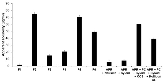 Water solubility of aprepitant (APR) in the formulations. Results are expressed as the means ± SD of three independent experiments (n = 3). F1: pure APR; F2: solid dispersion consisting of APR and phosphatidylcholine (PC); F3: solid dispersion consisting of APR, PC, and Neusilin®; F4: solid dispersion consisting of APR, PC, and Syloid®; F5: solid dispersion consisting of APR, PC, Neusilin®, and croscarmellose sodium (CCS); F6: solid dispersion consisting of APR, PC, Neusilin®, and Kollidon® CL.
