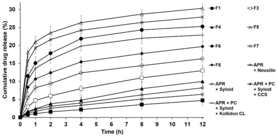 The drug dissolution rate profiles of APR for the solid dispersions in dissolution media (0.3% SLS) were obtained as outlined in USP Dissolution Test 2. Figure 8 shows the drug dissolution results of the formulations F1 to F8. The dissolution rates for all formulations were higher than that for pure APR in dissolution media. The APR dissolution rate of F5 was the greatest among the tested formulations and was approximately 6.5 times higher than that of pure APR. When compared to the dissolution rate of F3, the rate of F5 was ~2 times higher. This characteristic could be attributed to the high hygroscopicity of CCS as the hydrophilic ingredient. CCS quickly absorbs water into its microfibrils and acts as a hydrophilic channel drawing liquid into the solid dispersion by swelling, thus accelerating dissolution of APR [60,61]. With the formulations using disintegrants, the dissolution rate of APR from the solid dispersion using CCS was significantly higher than that of the formulation using Kollidon® CL. This suggests that the hydrophilic property of CCS is higher than that of Kollidon® CL [62]. In this sense, the hydroxyl group (-OH) of CCS might interact more strongly with water than the C=O of Kollidon® CL [63]. The drug release rate was higher for F3 than for F4. Additionally, the drug release rates were higher for F5 and F6 than for the formulations using (Syloid® and CCS) and (Syloid® and Kollidon® CL), respectively. This suggests that Syloid® keeps APR in its pores more strongly than Neusilin®, as mentioned above in the XRPD study. Therefore, the dissolution rate of APR from the formulation using Neusilin® was higher than that from the formulation using Syloid®. Indeed, similar results were previously reported by Alwadei et al. [58] and Seljak et al. [59] with self-micro/nanoemulsifying drug delivery systems, where the drug release rates of the formulations using Neusilin® US2 were higher than those of the formulations using Syloid® 244 FP, where formulations included disintegrants. When comparing APR dissolution rates of F3 and F4 (PC containing APR dispersions in Neusilin® or Syloid®) with APR dispersions in Neusilin® or Syloid®, without PC, the dissolution rates were higher for F3 and F4 than for the formulations composed of APR and Neusilin® or Syloid®. This clearly suggests that PC can act as solubility enhancer due to its amphiphilic nature and the increased solubilization effect of APR resulted in the faster APR release. Regarding polymer-based solid dispersions, the drug release rates of F7 and F8 were significantly higher than those of F1, F3, and F4 but not to the extent of the formulation using PC, Syloid®, and Kollidon® CL. This suggests that the hydrophilic ingredients, such as PVP K30 and PEG 6000, can facilitate absorption of water into the microfibrils and, therefore, the dissolution rate of APR from the solid dispersion was improved. Comparing both polymer-based solid dispersions, the drug release rate of F8 was significantly higher than that of F7. This suggests that the hydrophilic property of PEG 6000 is better than that of PVP K30. This is indicative of the hydroxyl groups (-OH) in PEG 6000 interacting with both the NH (secondary amine) and C=O in APR, while the C=O groups in PVP K30 form H-bonds with only the NH (secondary amine) in APR, as shown in the FTIR studies. Thus, the APR-loaded and PC-based solid dispersions prepared with Neusilin® and CCS as adsorbents and disintegrants, respectively, are expected to exhibit superior solubility and dissolution rates for APR in water.