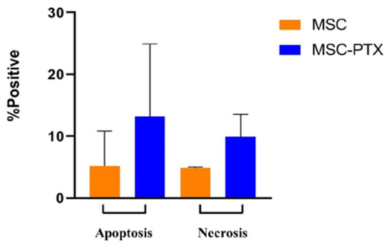Only a small percentage of MSCs-PTX displayed necrotic and/or apoptotic features but not significant differences compared to control untreated MSCs were found: necrotic cells were 9.9% ± 3.6% vs. 4.83% ± 0.2% (mean ± SD), apoptotic cells were 13.2% ± 11.72% vs. 5.2% ± 5.64% (mean ± SD) (Figure 2).