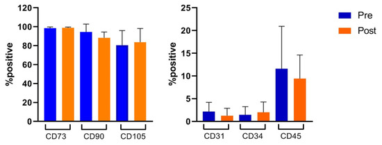 Flow cytometry analysis. Immunophenotypic characterization was performed by flow cytometry on MSC (n = 13) and MSC-PTX (n = 12) after the first expansion phase (pre) and after expansion and loading in Quantum cell expansion system (post), respectively. The percentage of positive cells is reported as the mean ± SD. No statistically significant differences were found (p > 0.5).