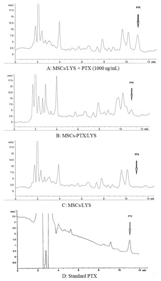 The drug incorporation of PTX by loaded MSCs was confirmed by HPLC analysis performed on nine samples. As shown by a standard HPLC chromatograms (1.000 ng/mL of PTX) (Figure 4A) the drug was eluted with a peak at 11 min. A peak with an identical retention time for PTX was eluted by processing MSCs-PTX/LYS (Figure 4B). HPLC analysis revealed the presence of other non-specific peaks (at 2.5–4 min) due to compounds produced by cells that do not correlate with the presence of PTX, these peaks also being present in the chromatogram of MSCs/LYS, used as control (Figure 4C). Figure 4D represents the standard chromatogram of PTX. The presence of the main PTX metabolite (6 alpha-hydroxypaclitaxel), normally eluted at 5.5 min, and of other PTX metabolites can be excluded (p > 0.5) [32].