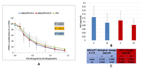The anticancer activity of MSCs-PTX was evaluated by testing their cell lysate on the tumor cell line CFPAC-1, used as reference cells to validate the antitumor efficacy [33]. The antiproliferative effect of different dilutions of the cell lysates from cryopreserved MSCs-PTX (MSCs-PTX/LYS-FT), fresh MSCs-PTX (MSCs-PTX/LYS-F), and untreated MSCs obtained through bioreactor procedure were compared (Figure 5). Both MSCs-PTX/LYS-F and MSCs-PTX/LYS-FT induced a significant inhibition of CFPAC-1 proliferation showing a dose–response kinetics that was expressed as percentage of proliferation normalized on the basal value produced by control lysates, obtained from untreated MSCs. A significant linear regression slope (p < 0.001) and high coefficient of correlation (R2) were found (Figure 5A). As reported in Figure 5B,C, the biological dosage performed by comparing the dose–response inhibition curve of MSCs-PTX with that of pure PTX estimated the PEC values that indicate the amount of a drug incorporation for single cell, that was 0.094 ± 0.05 pg/cell (mean ± SD) for MSCs-PTX/LYS-FT and 0.124 ± 0.059 pg/cell (mean ± SD) for MSCs-PTX/LYS-F; the difference was not statistically significant (p > 0.1). Based on the amount of drug incorporated and carried by each cell, we estimated that, in order to produce 50% inhibition of CFPAC-1 proliferation, about 1.2 × 104 of PTX loaded cells were required. The amount of PTX incorporated by MSCs evaluated by the biological activity on CFPAC-1 was also compared with those evaluated by HPLC analytical method. As shown in Figure 5C lower activity of the frozen samples correlated with a lower dosage by HPLC. However, these differences were not statistically significant (p > 0.3).