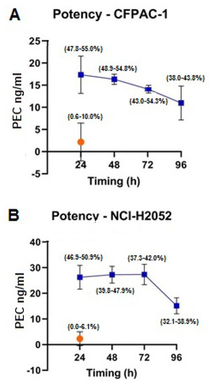 Potency. MSCs-PTX-derived Conditioned Medium (MSCs-PTX/CM) antiproliferative activity (blue line) on (A) the target pancreatic adenocarcinoma cells CFPAC-1 and (B) the mesothelioma cell line NCI H2052. Data are expressed as Paclitaxel Equivalent Concentration (PEC ng/mL, y axis). The x axis represents the time of CM collection after starting culture; the percentages of inhibition of cell line proliferation (range min–max) are delimited by parentheses (round brackets) at each time point. As shown, the antitumor activity of MSC-PTX/CM is already evident at 24 h, remained constant at 48 and 72 h, and decreased only at 96 h from initial culture. CM: orange dot represents the effect of CM from untreated MSCs (CTRL: control).