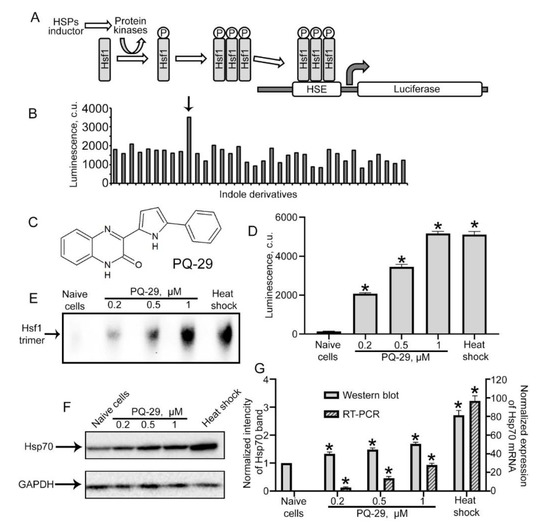 Searching for a new Hsp70 synthesis inducer. (A) The general scheme of the test system that we used for screening. (B) Typical screening result. The arrow marks the positive compound. (C) The chemical formula of the Hsp70 inductor PQ-29. (D) The result of the action of PQ-29 on C6-luc cells. Histogram bars illustrate the luciferase activity in cells. (E) Data of the Hsf1 trimer analysis. (F) Immunoblotting data. C6 cells were treated with PQ-29 in concentrations marked on the figure. Cells were analyzed 18 h after PQ-29 addition. Glyceraldehyde-3-phosphate dehydrogenase (GAPDH) is presented as a loading control. (G) The data of real-time polymerase chain reaction (RT-PCR) analysis and the data of immunoblotting quantification are presented. Non-patterned histogram bars show the relative intensity of Hsp70 band from F to intensity of GAPDH band normalized to this meaning for naïve cells accordingly to left Y-axis. Patterned histogram bars show the relative amount of mRNA transcribed from the hsp70 gene in C6 cells one hour after PQ-29 addition normalized to the amount of GAPDH mRNA accordingly to right Y-axis. Data presented as mean ± standard error of mean (SEM). Statistical significance is indicated as * p < 0.05.